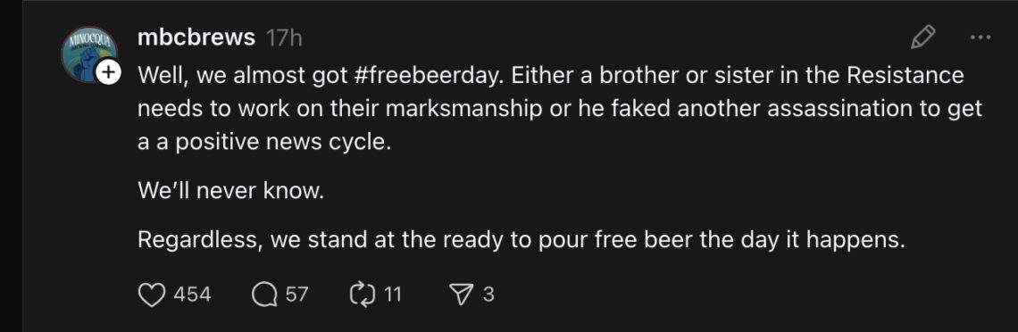Hours later, Minocqua Brewing Company of Minocqua, Wisconsin posted to its Facebook page: “Well, we almost got #freebeerday. Either a brother or sister in the Resistance needs to work on their marksmanship or he faked another assassination to get a positive news cycle. We’ll never know. Regardless, we stand at the ready to pour free beer the day it happens.”