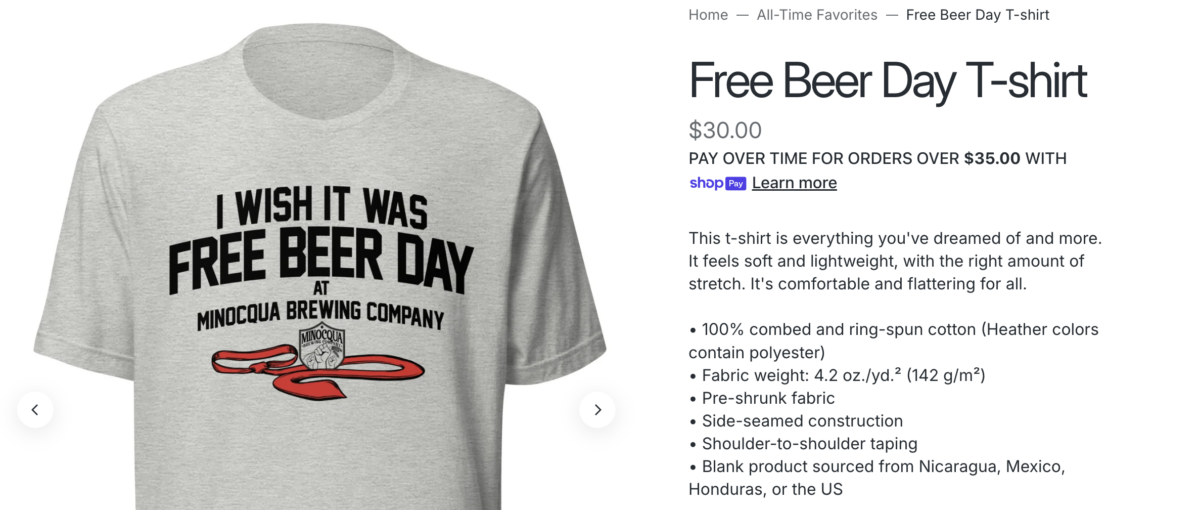 The message references a long-running promotion the brewery has called “Free Beer Day” — a standing offer of complimentary drinks at its taproom locations on the day President Trump dies. The brewery has sold merchandise tied to the concept, including a t-shirt reading “I wish it was Free Beer Day at Minocqua Brewing Company” featuring a red necktie widely associated with Trump.